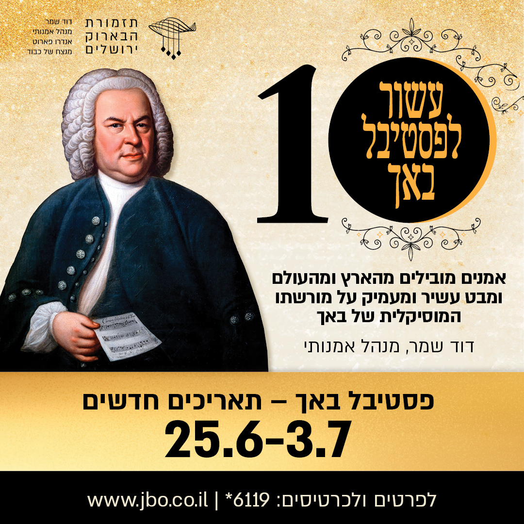 פסטיבל באך, מבית תזמורת הבארוק ירושלים, מציין השנה עשור של פעילות – עשר שנים של מפגש חי ותוסס עם יצירתו של יוהן סבסטיאן באך. הפסטיבל, האירוע היחיד בישראל שחוגג מדי שנה את הולדתו של גדול המלחינים כמקובל ברבות מבירות התרבות בעולם, מארח בירושלים אמנים מובילים מהארץ ומהעולם ומציע מבט עשיר ומעמיק על מורשתו המוסיקלית.